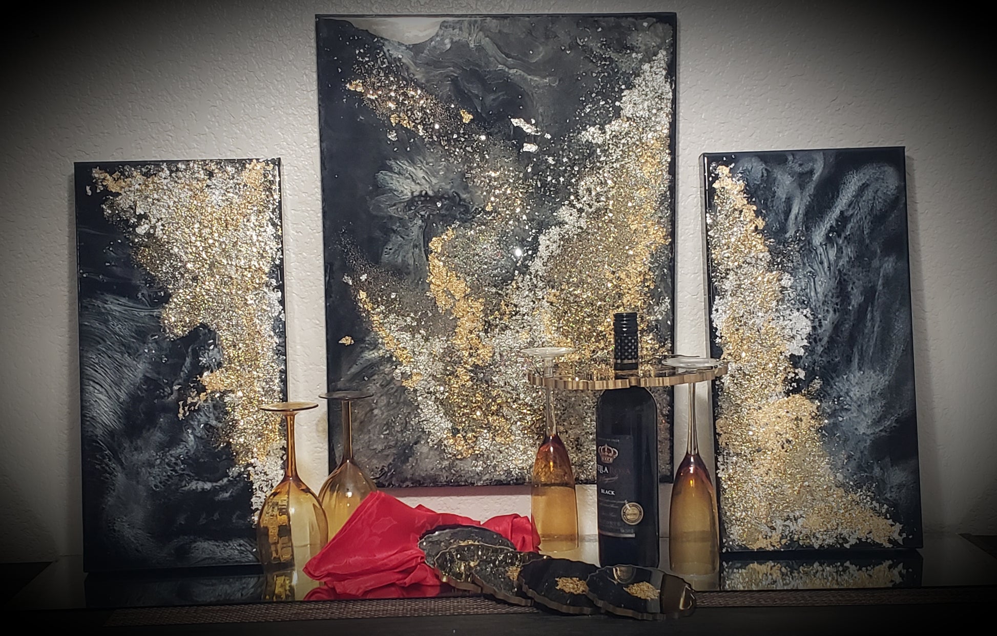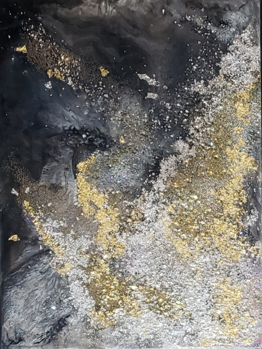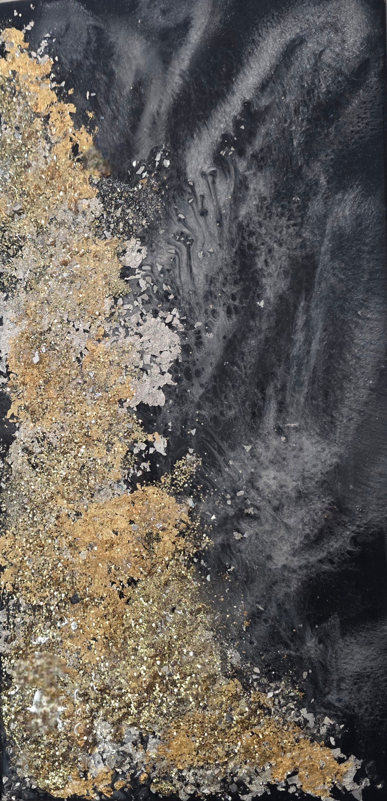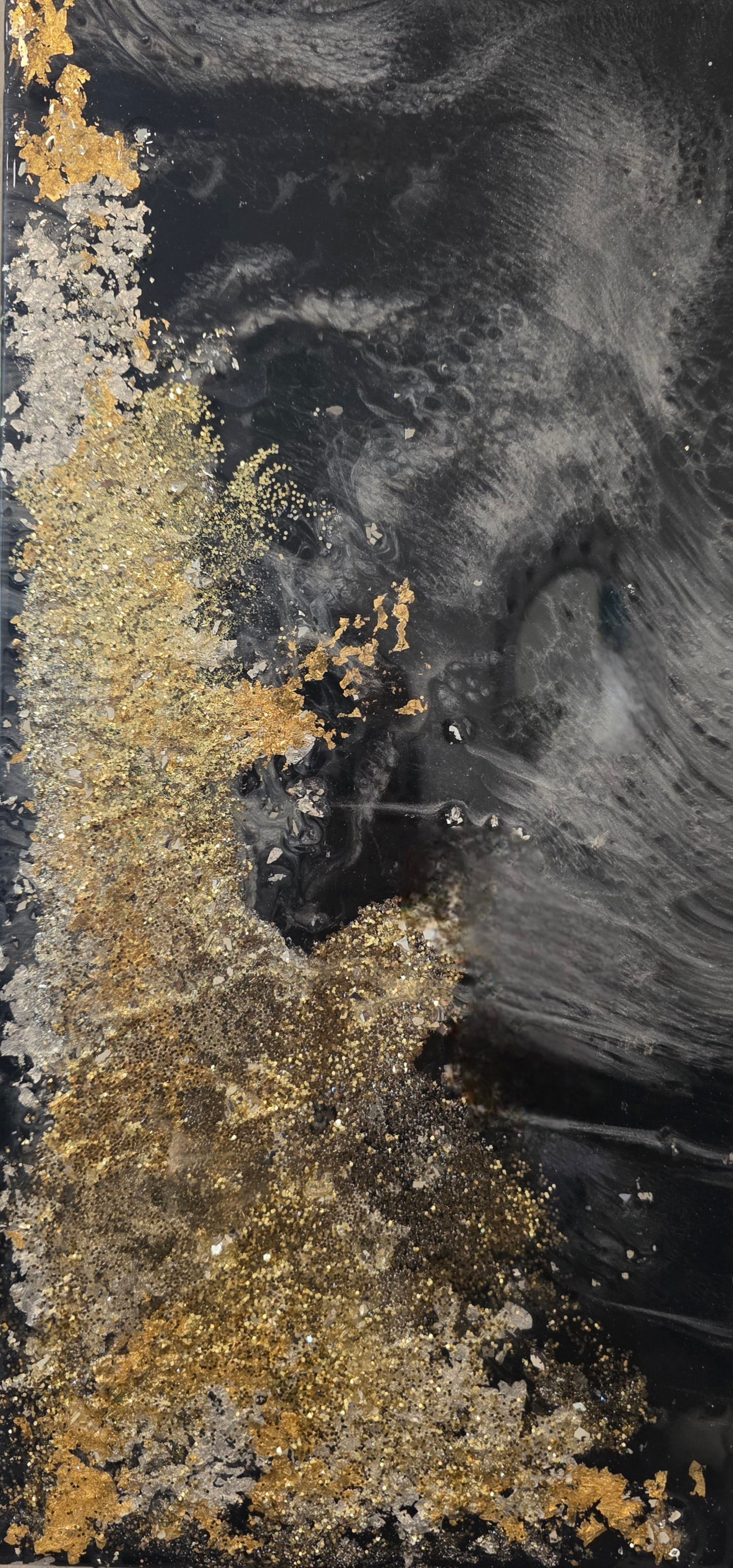 This liquid pour is adorned with beautiful clusters of gold leaf and glitter in silver and gold creating an elegant finish. It has been meticulously resined and is now ready to be hung. Measuring 1*15x24" and 2*10.20", it is the perfect addition to any home decor.