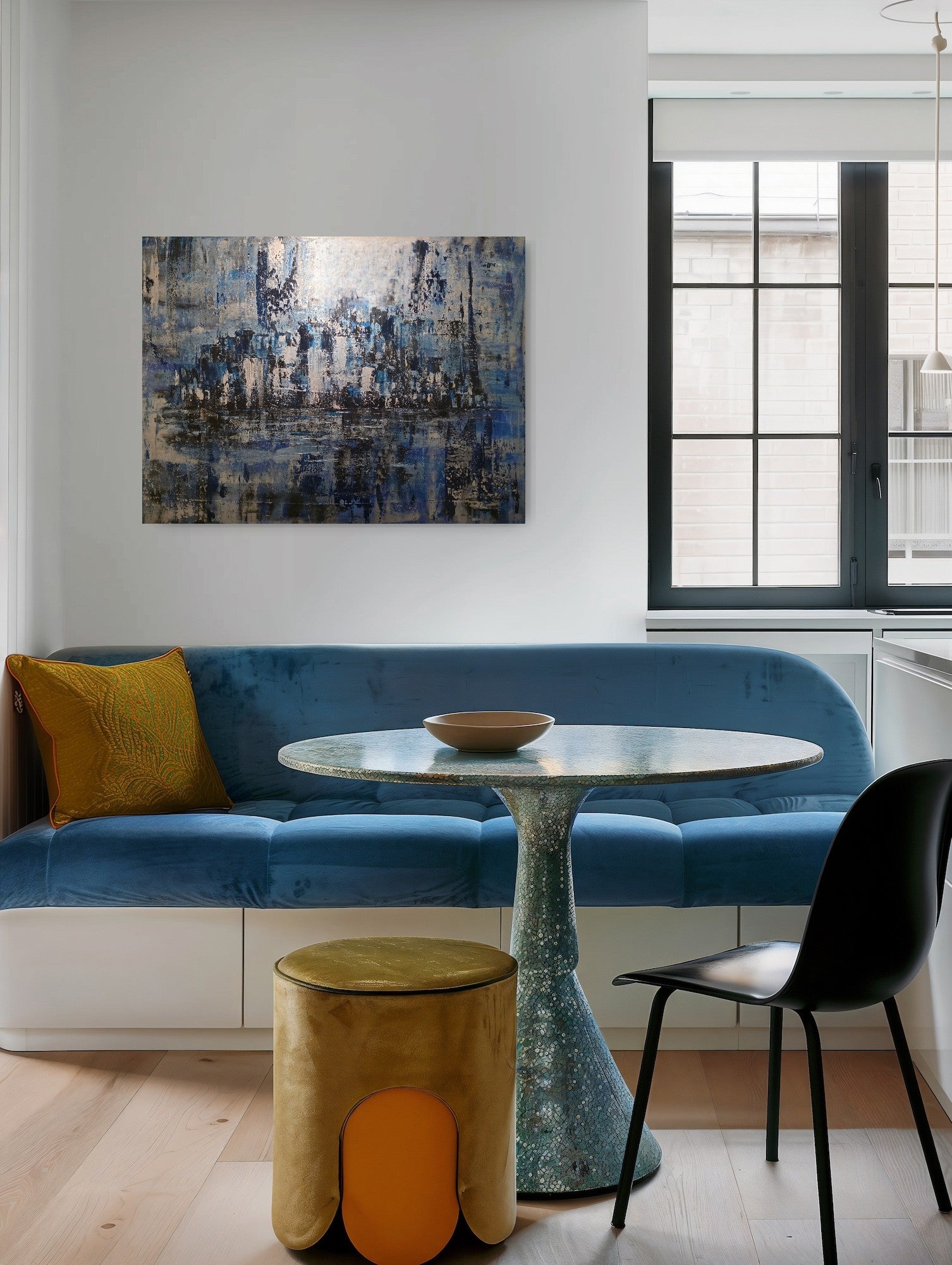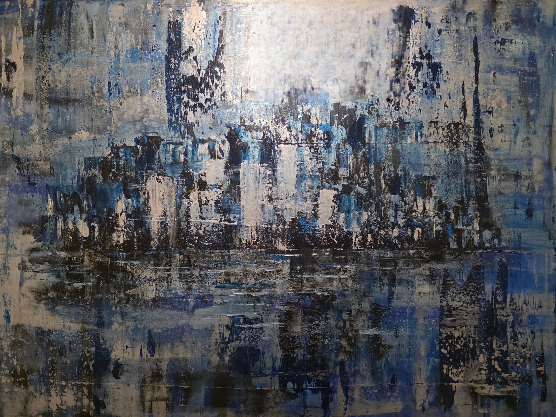 "Expressive blue abstract cityscape with silver metallic elements. Original 30x40 contemporary art by Montante Art. Perfect for brightening any room."