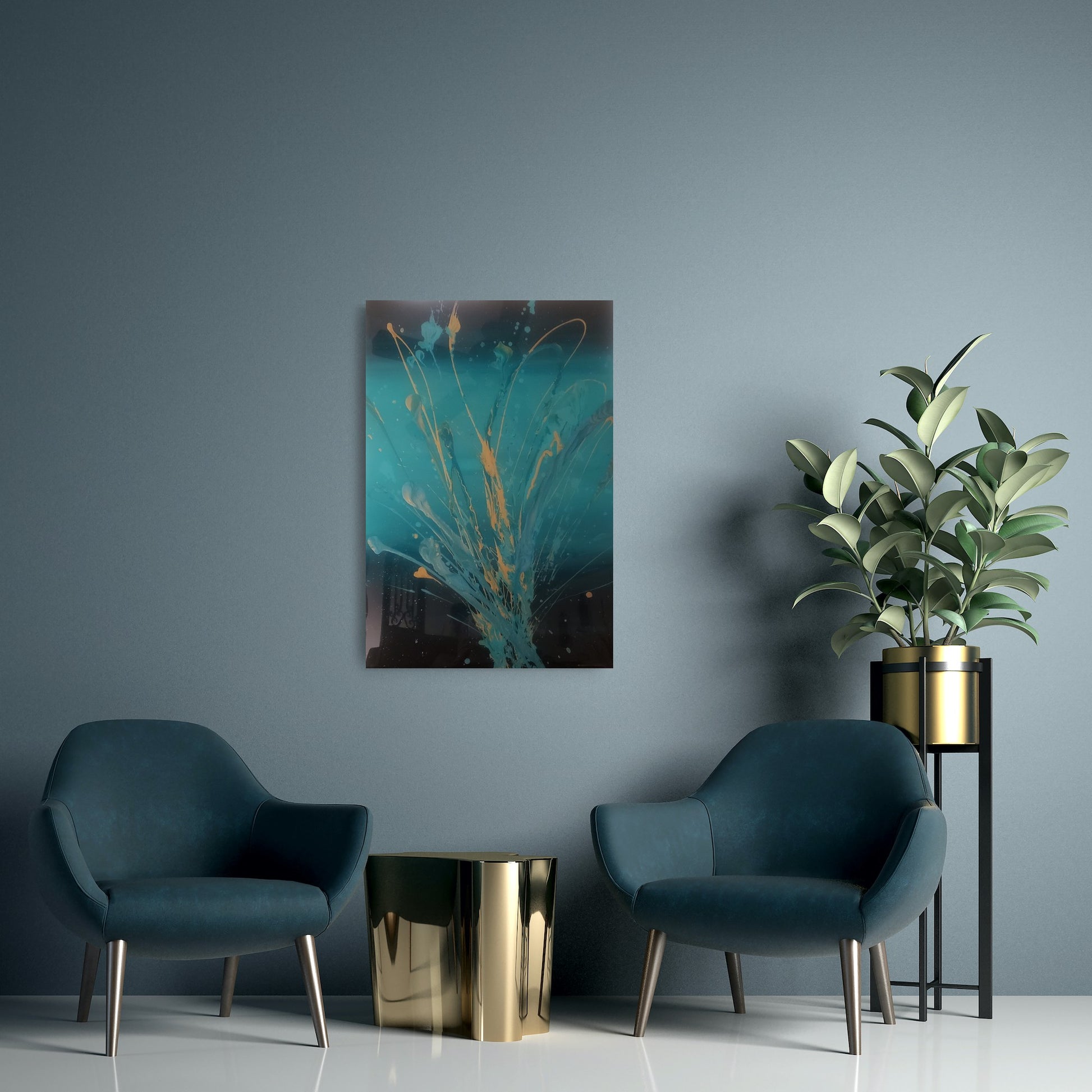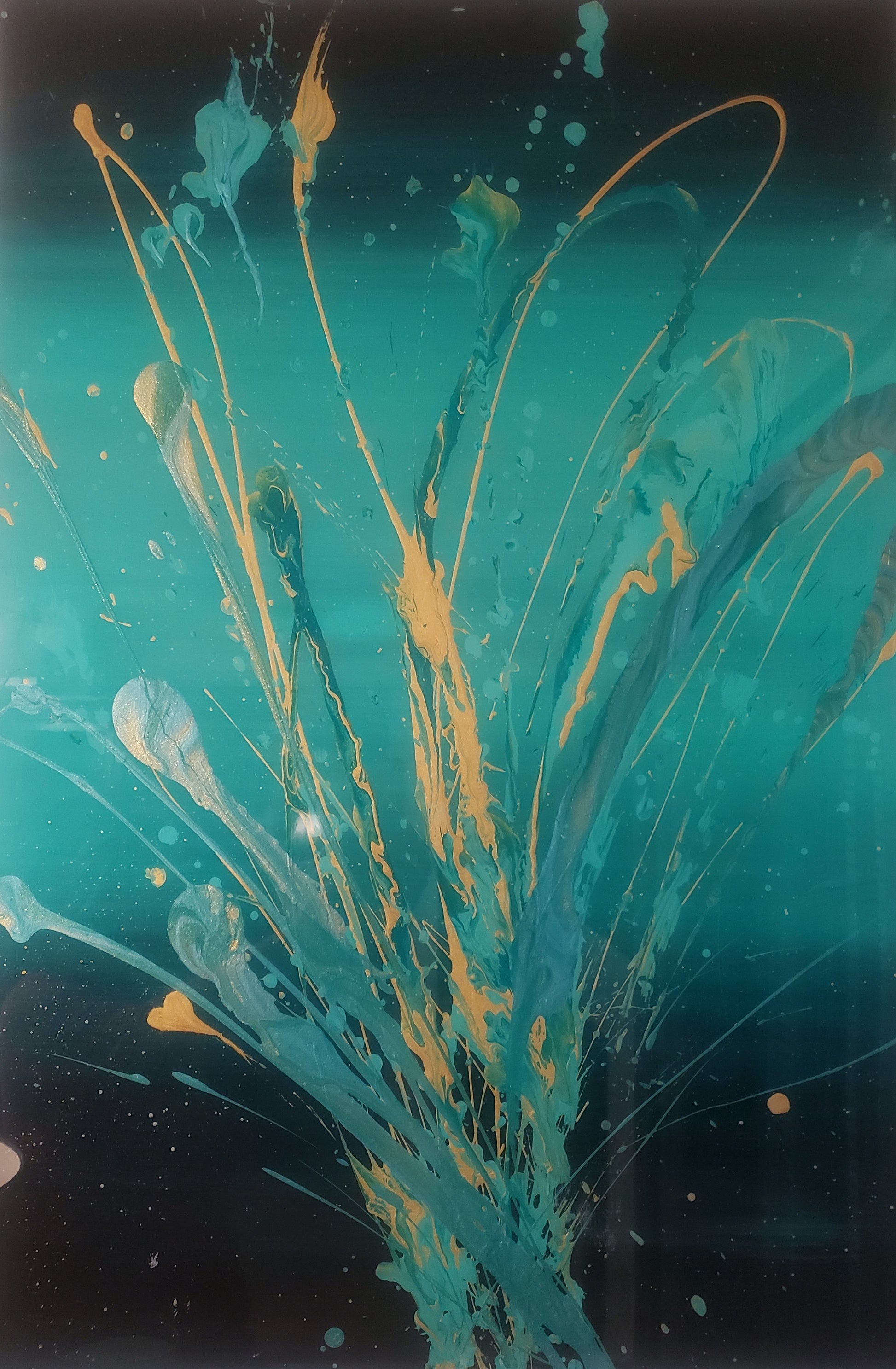 One of a series of five, all with a heart of love. Crafted with expertise and precision, this 25x36x2" wooden art piece showcases mesmerizing turquoise swirls highlighted with elegant gold accents and glittered edges. Using the fluid art technique, this masterpiece is completed with a smooth resin finish and is ready to be hung and admired.