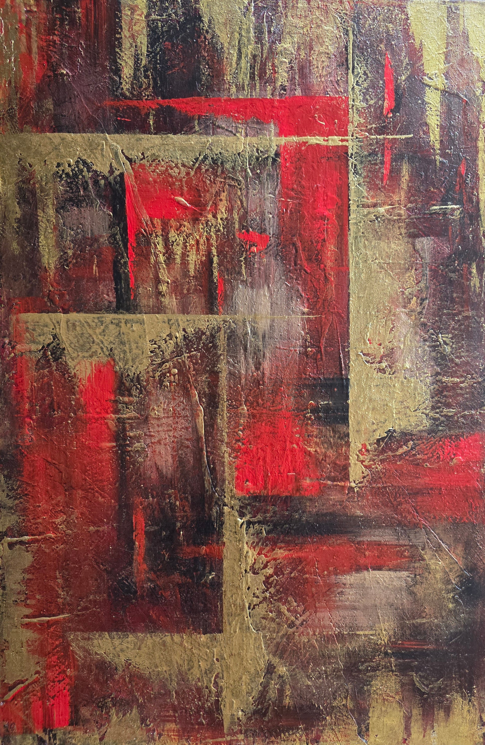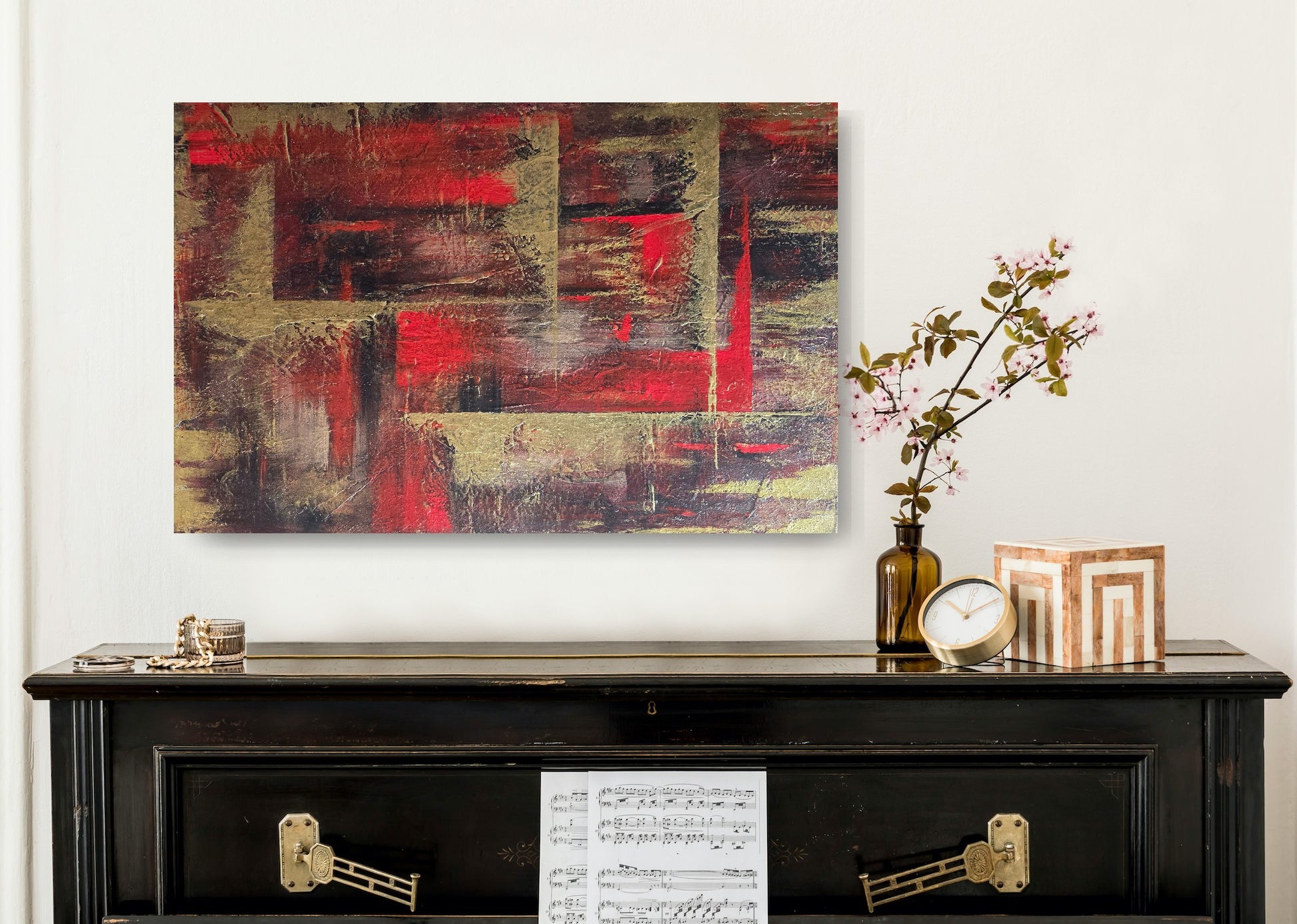 "Minimalist red and gold abstract acrylic painting inspired by transformation and success. Original 24x36 contemporary art by Montante Art. Ready to hang."