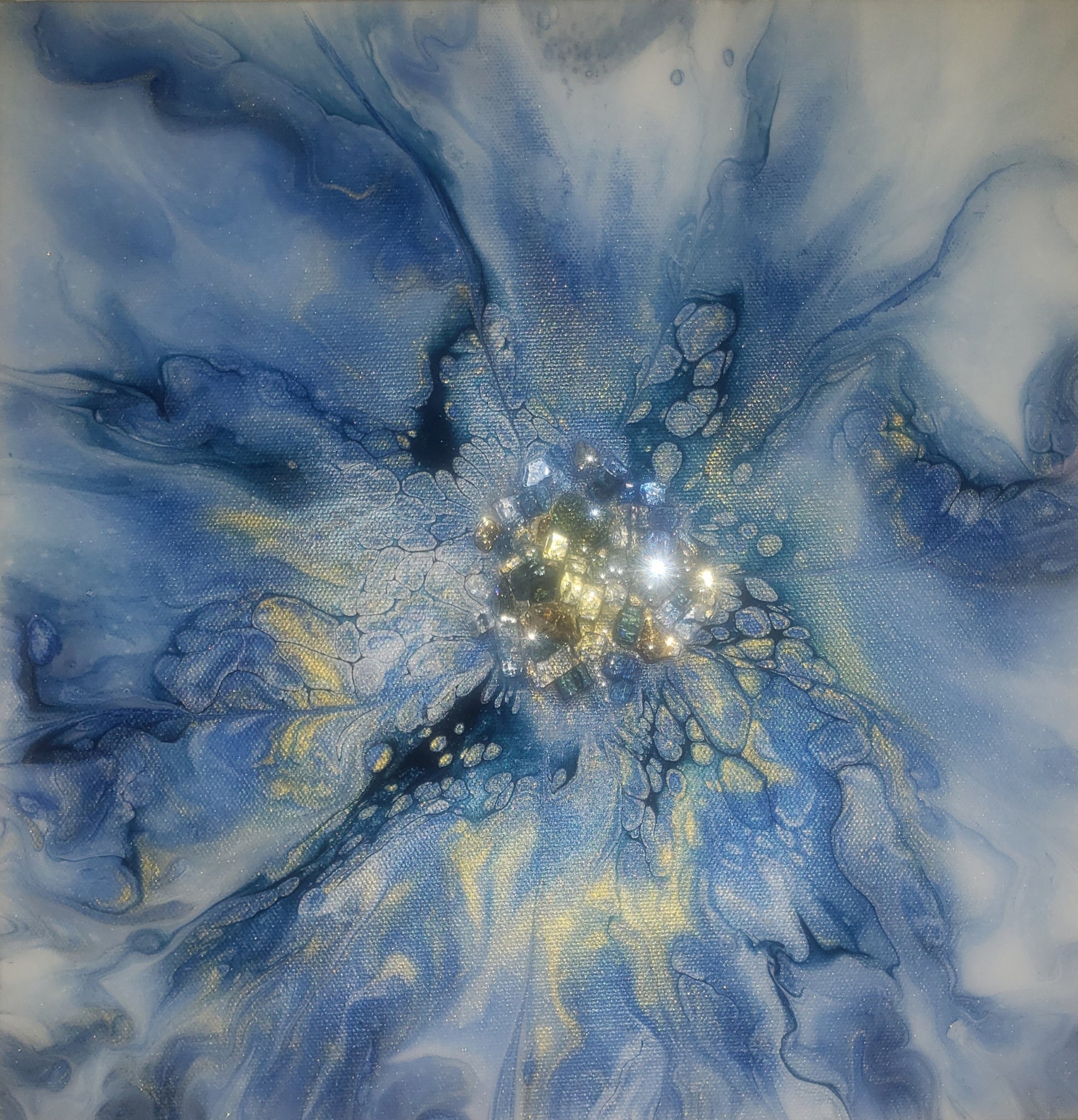 Blue hues with an embellishment and a resin finish. Ready to hang in your home. Measures 12x16 inches. Makes a statement.