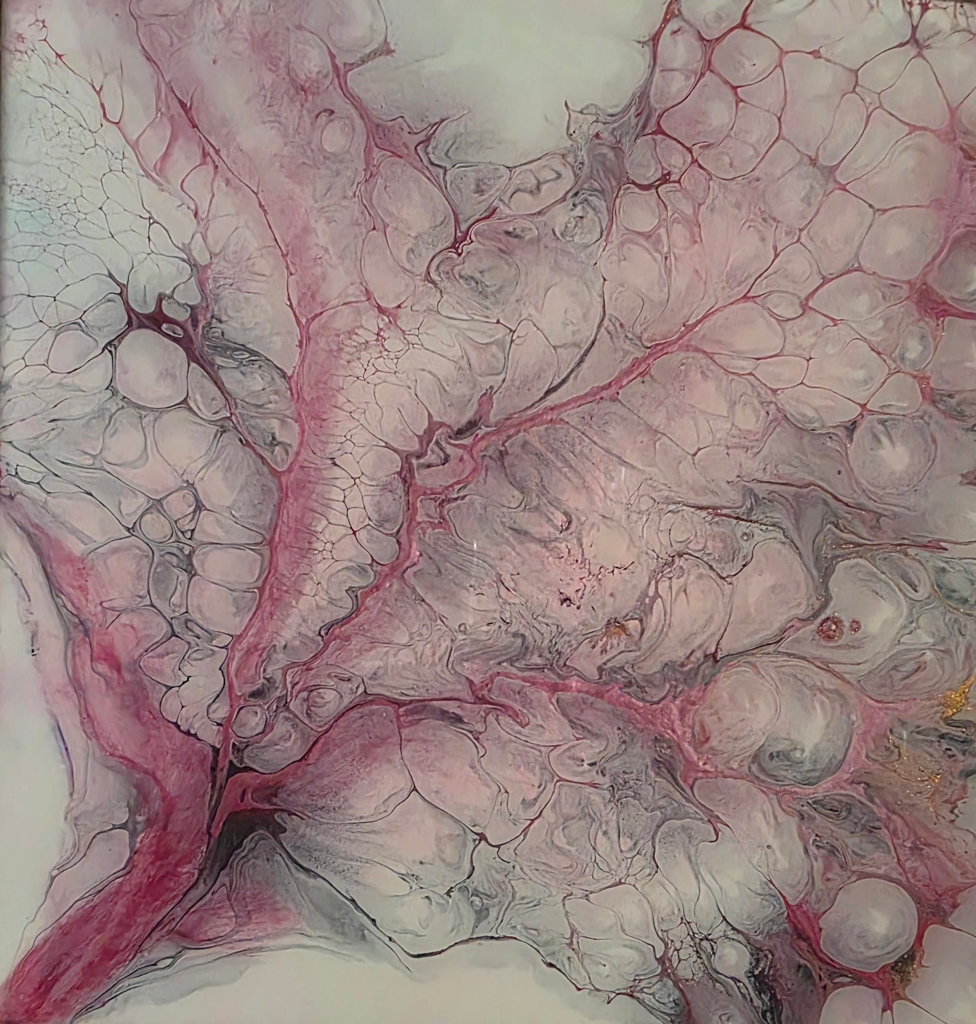 This unique technique, known as "The pearl cloud," creates stunning intricate cells in shades of pinks. Reminiscent of cotton candy on a 10x10x1.5" canvas.