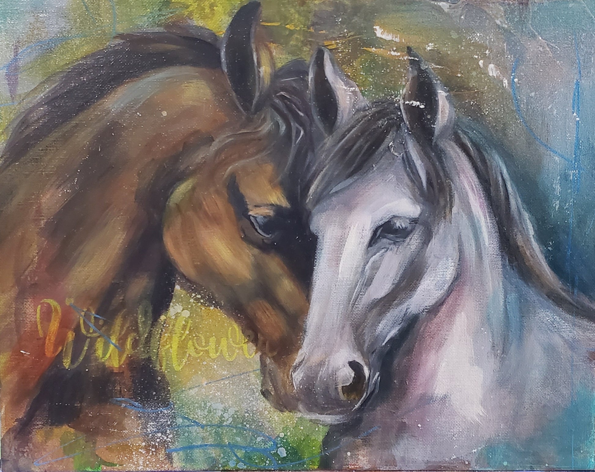"Heartwarming abstract horse painting in mixed media oil on 11x14 canvas panel. Original custom contemporary art by Montante Art. Love-themed piece."