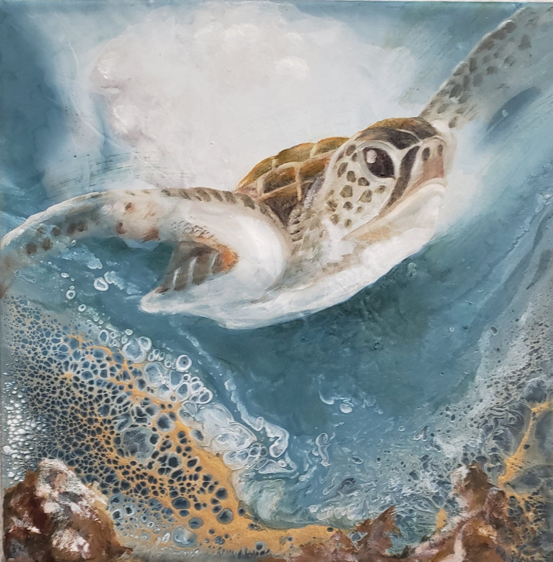 "Romantic abstract realism turtle painting in mixed media oil on 10x10 canvas. Original custom contemporary art by Montante Art. Small love-themed piece."