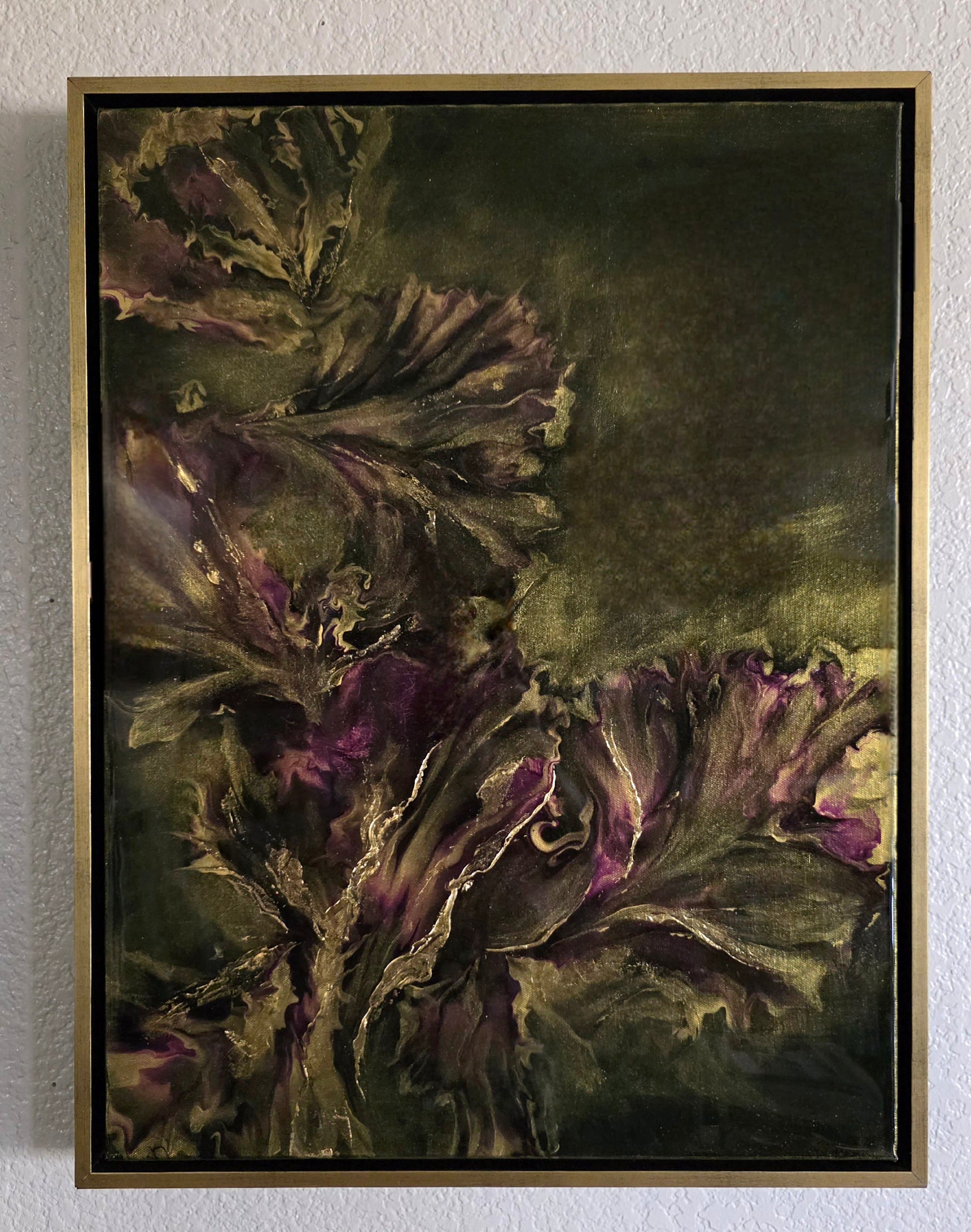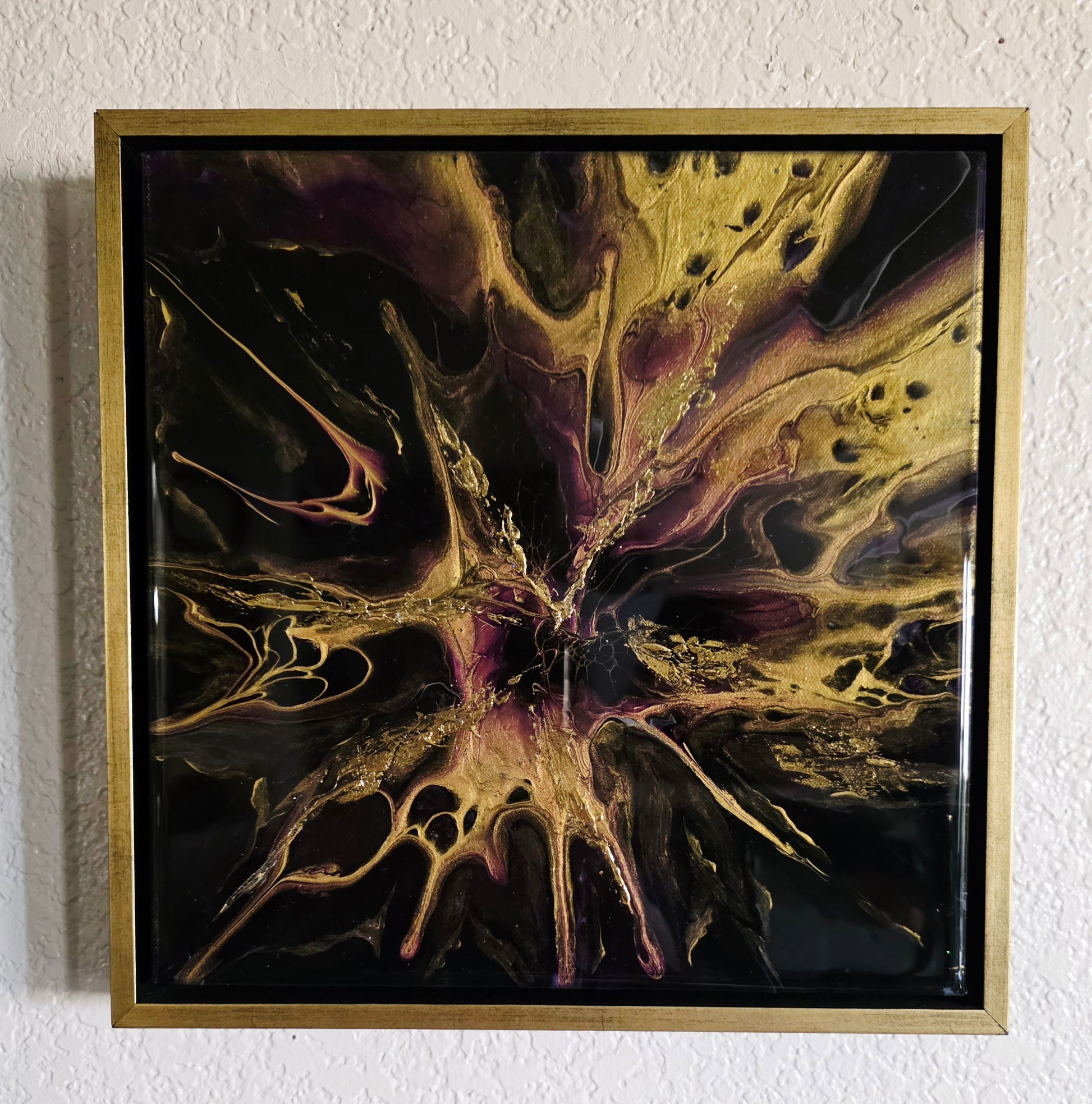 This 2 pc. is a sophisticated set of purple and gold metallic that perfectly complement a purple-themed space, providing a vivid and striking appearance. Each pour measures at 18x24x1.5" and 12x12x1.5", and is expertly crafted using a liquid pour technique for a luxurious finish. The elegant frames add a touch of class to the pours, And are ready to hang.