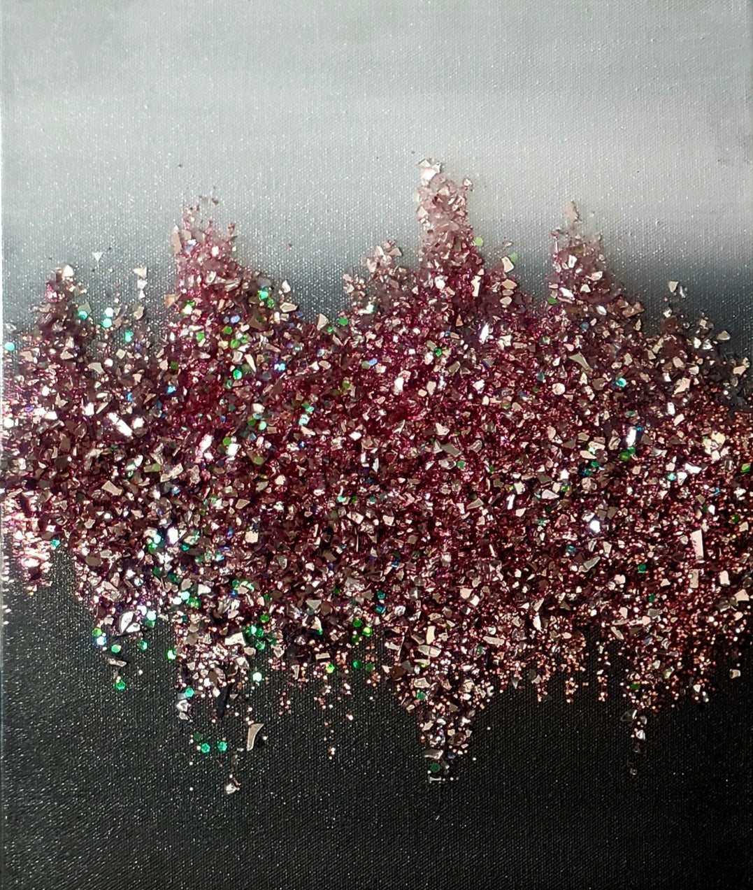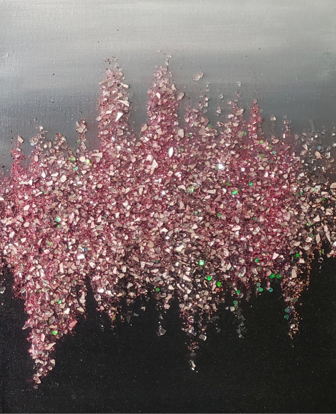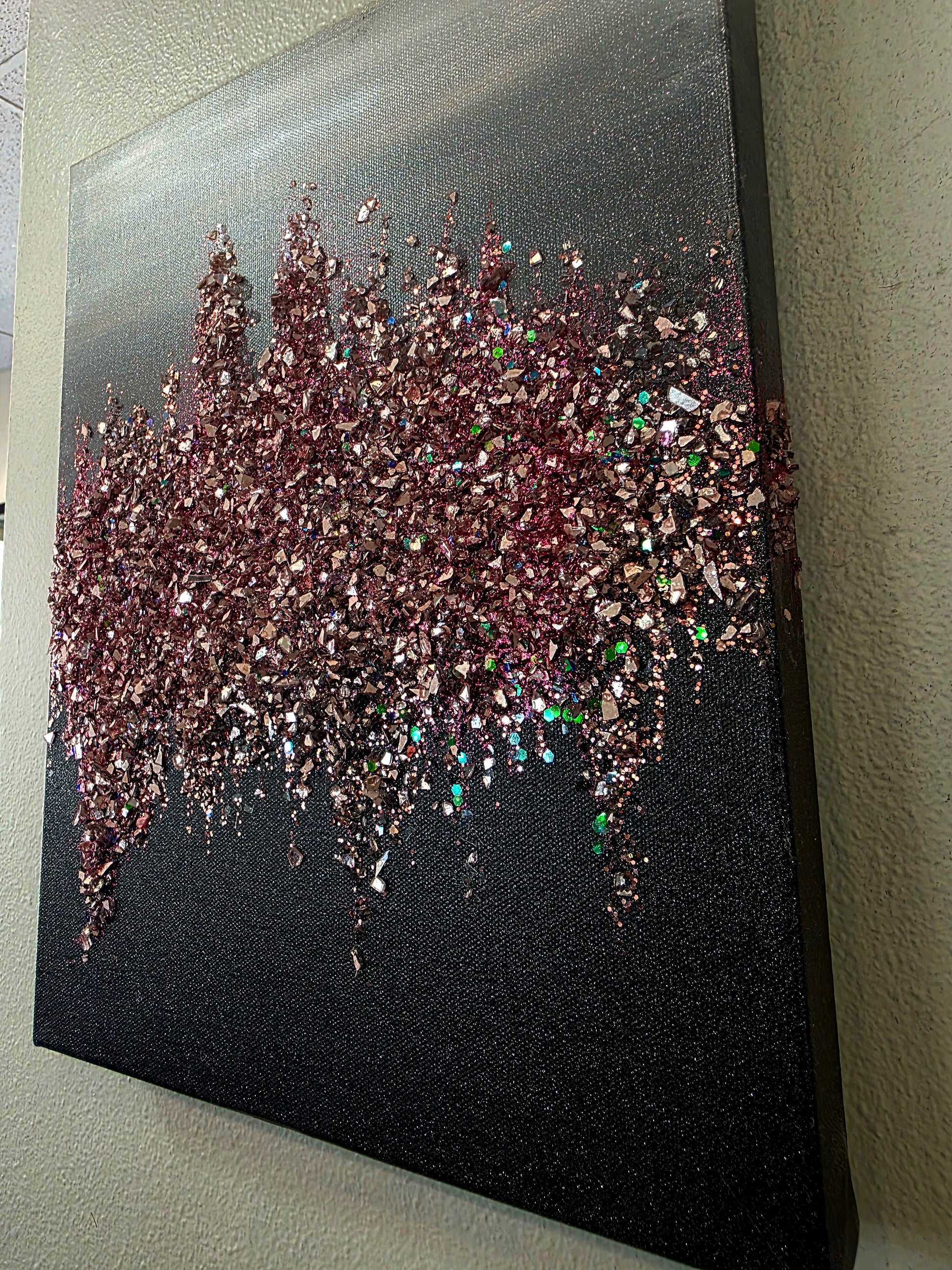 Sml Pink Bling 2pc is a stunning piece featuring gray and black gradient background, and pink rhinestones that glimmer elegantly. Enhanced with glitter for extra spark. 12x12x1.5" canvas
