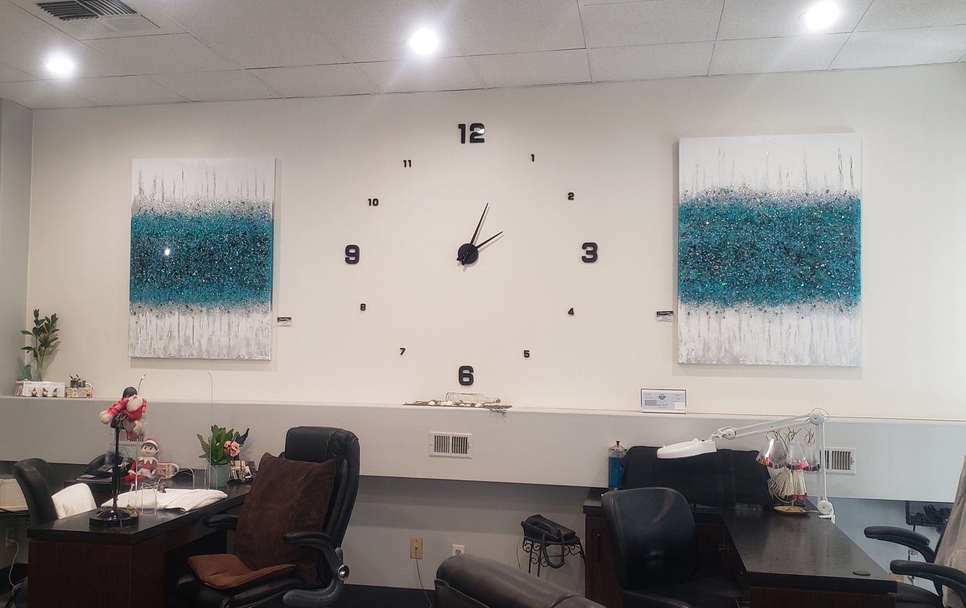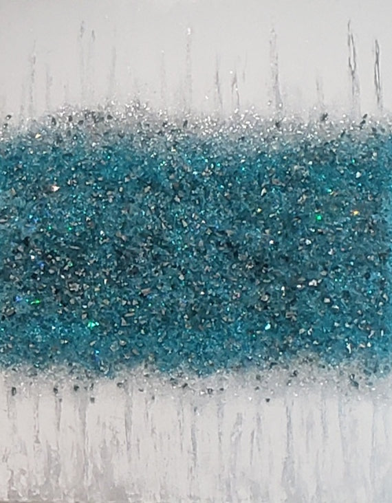 An exquisite addition to a large room. This 2 pc. set of canvas artwork boasts a textured design in white and metallic silver, highlighted with a touch of gold paint. Embellished with Turquoise Rhinestone Bling featuring a fire glass pattern and understated glimmers of glitter that reflect beautifully in the light. With dimensions of 36x48x1.5", this piece is guaranteed to captivate with its dazzling shine.