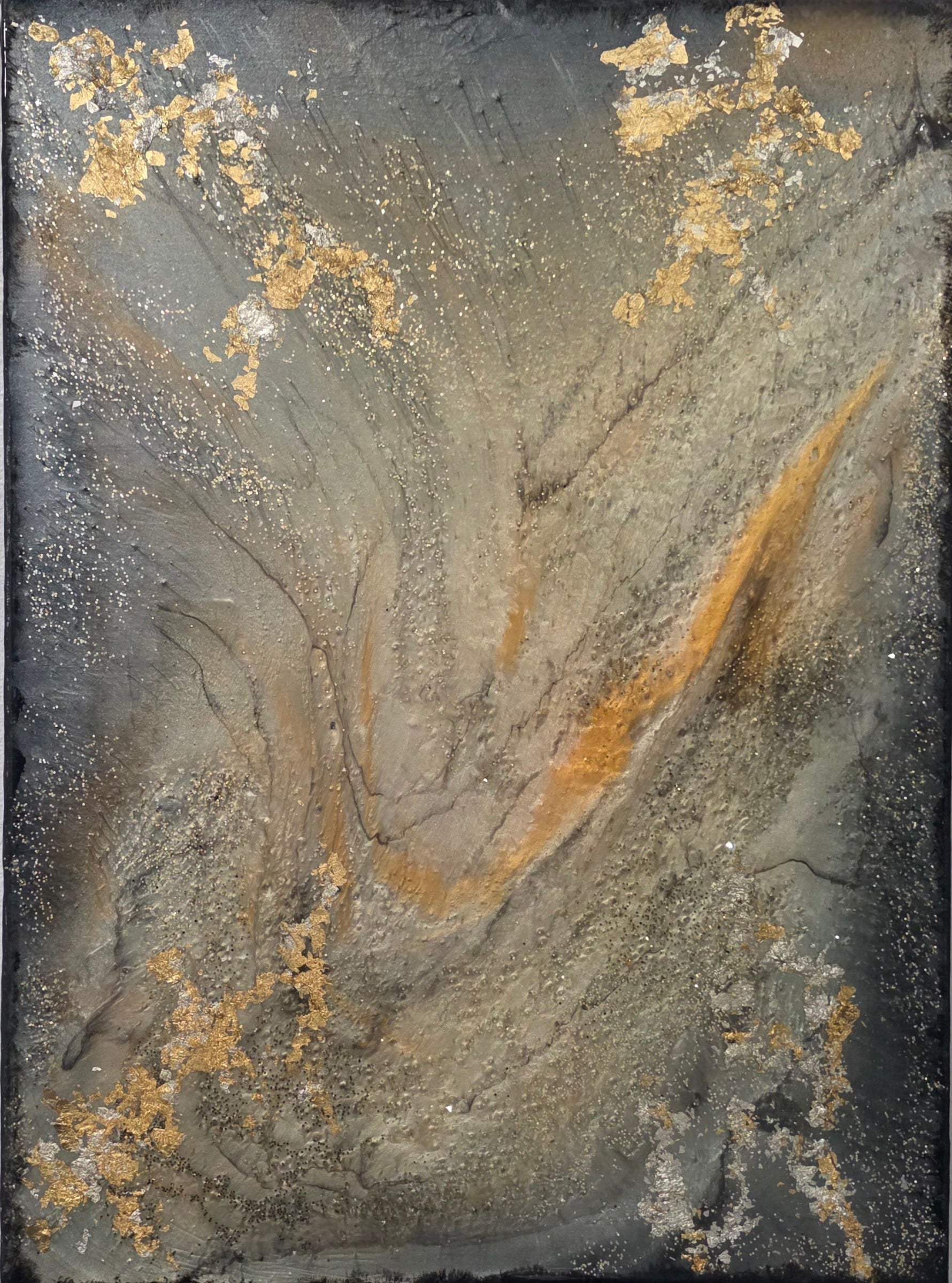 A cloudy vibe done in a liquid pour technique, with touches of gold designs with gold leaf and glitter. Finished with a coat of resin sparkling like wet glass and ready to hang in any room 18x24"